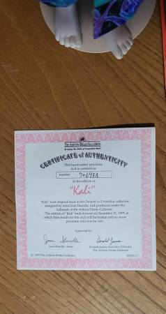 Kali is Asian / Pacific Islander ethnicity and is the second in the Passport to Friendship handcrafted porcelain doll collection by Ashton Drake Galleries. No original boxes but certificate and other paperwork included. This was my mother's. I'm also listing Serena, the first in this collection that she never even removed the wrapping from, though there is also no original box. I have other dolls of hers to list including the Laura Ingalls Wilder family as well as collectible plates.