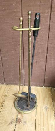 4 pieces including stand and poker that hangs on the back. Broom is not original and bristles are bent but functional.
