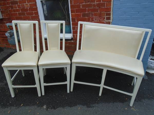 Dining set. Table, 1 bench, 2 chairs. Could use recovering but all is in very good shape and sturdy. Last picture shows the worst of the wear. Table is 36" high and 54" diameter Bench and chairs...